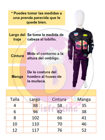 El disfraz incluye un traje completo que captura la esencia de la velocidad y la adrenalina de las carreras.